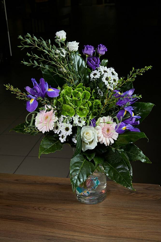 В состав букета входят: гортензия (1 шт), эустома (2 шт), ирис (3 шт), сантини (2 шт), зелень.