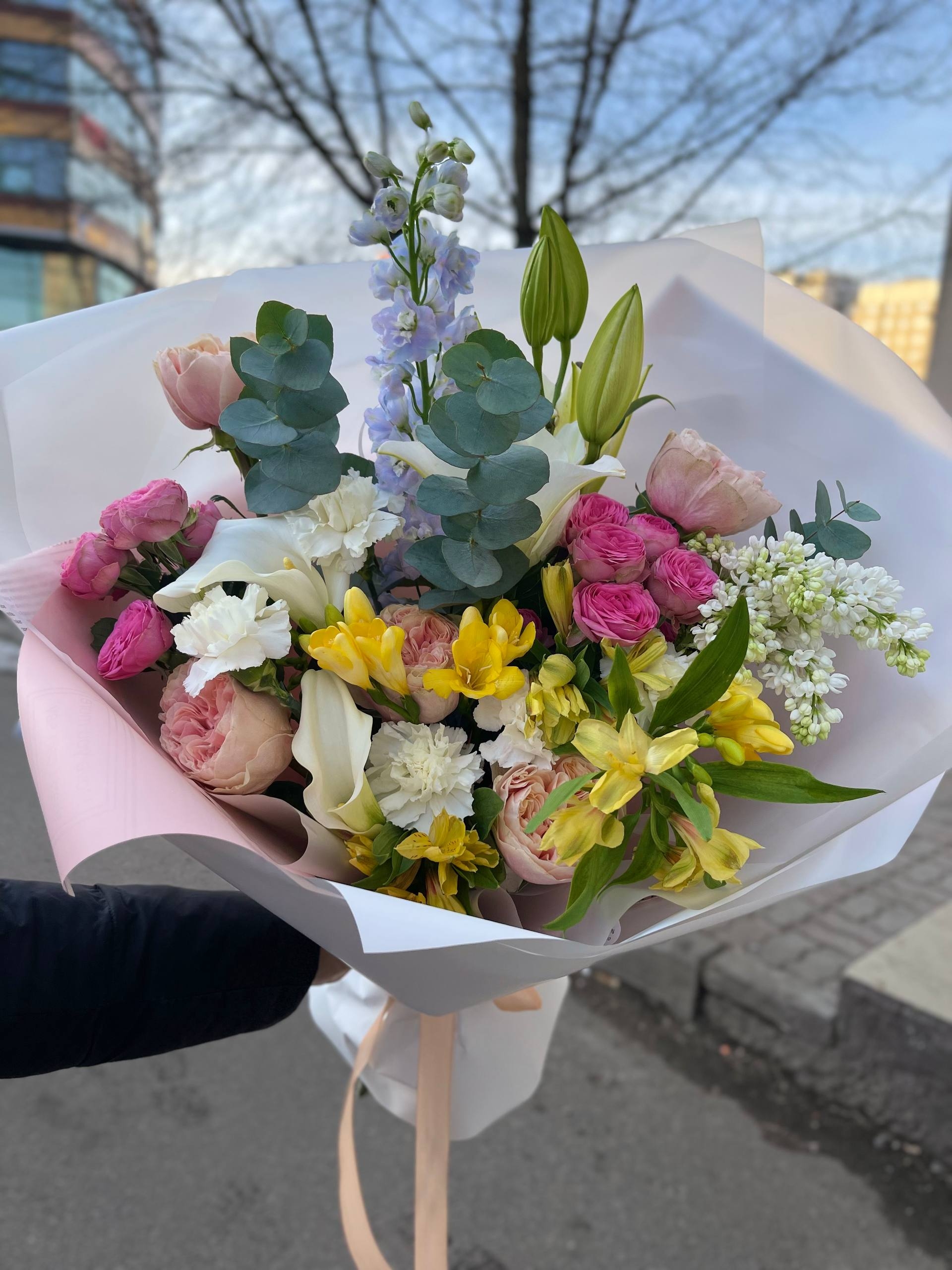Большой стильный, пышный букет из лилий, дельфиниума, калл, диантуса, роз, пионовидных роз и эвкалипта