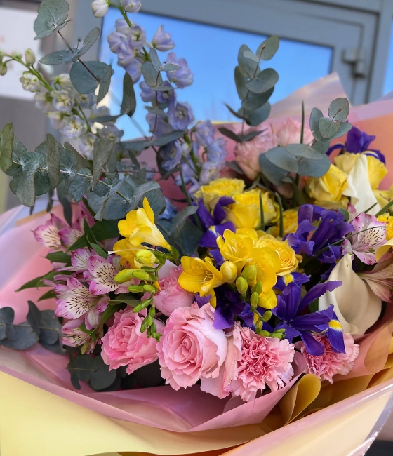 Большой пышный, роскошный букет с дельфиниумом, кустовой розой, ирисами, каллами, диантусом, эвкалиптом