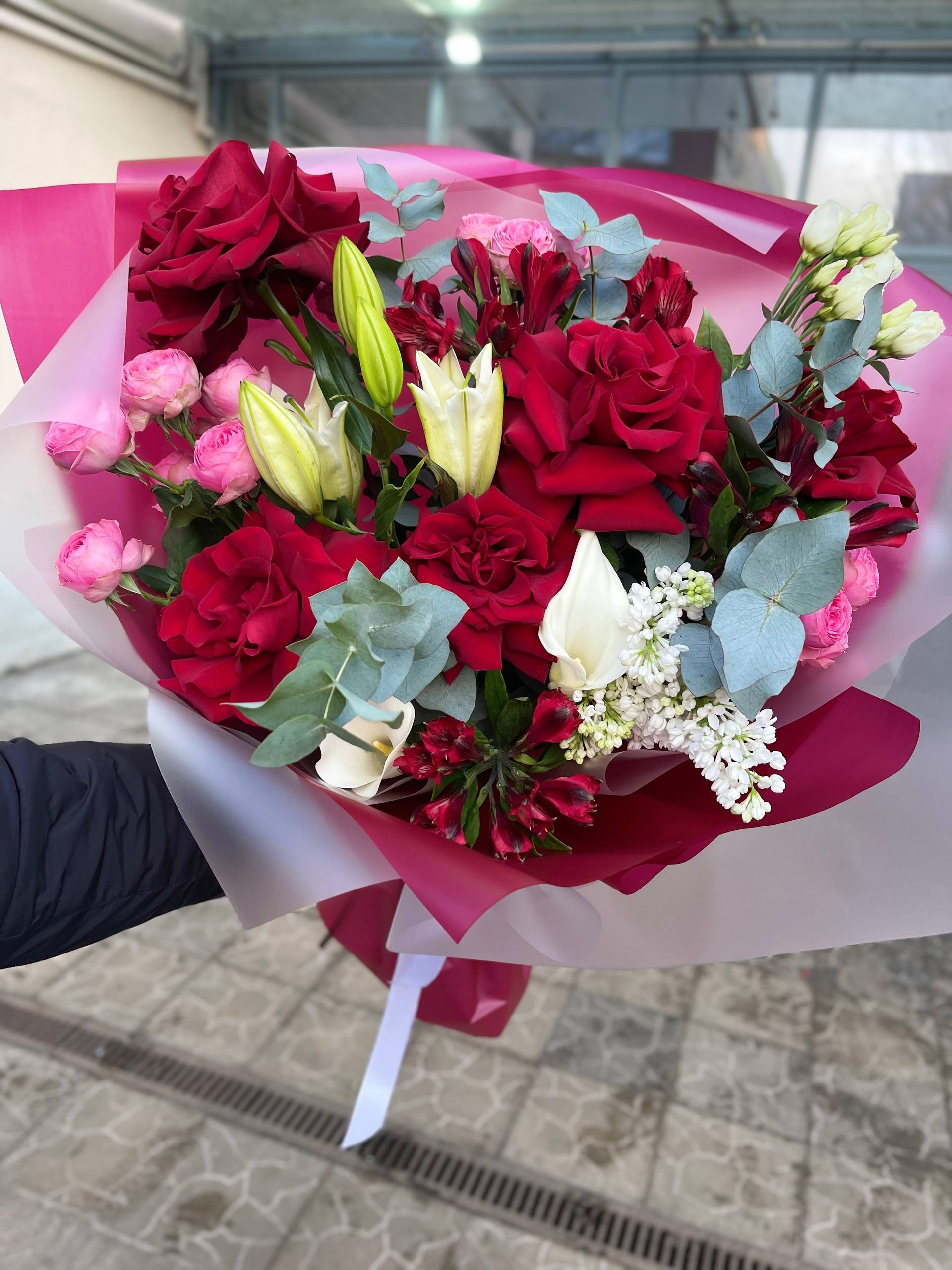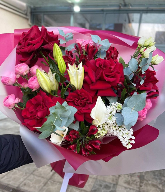 Большой, яркий букет из бордовых роз, лилий, пионовидных кустовых роз, альстромерии, эвкалипта