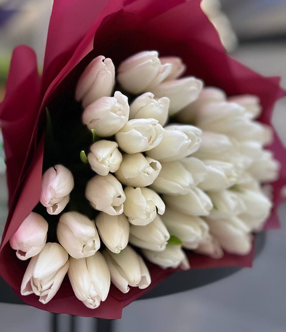 Букет из 51 белого тюльпана в яркой упаковке