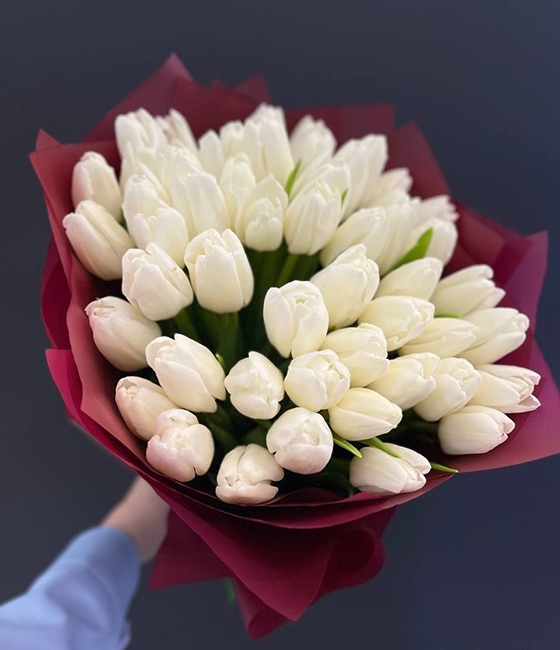 Стильный букет из 51 белого тюльпана в яркой упаковке