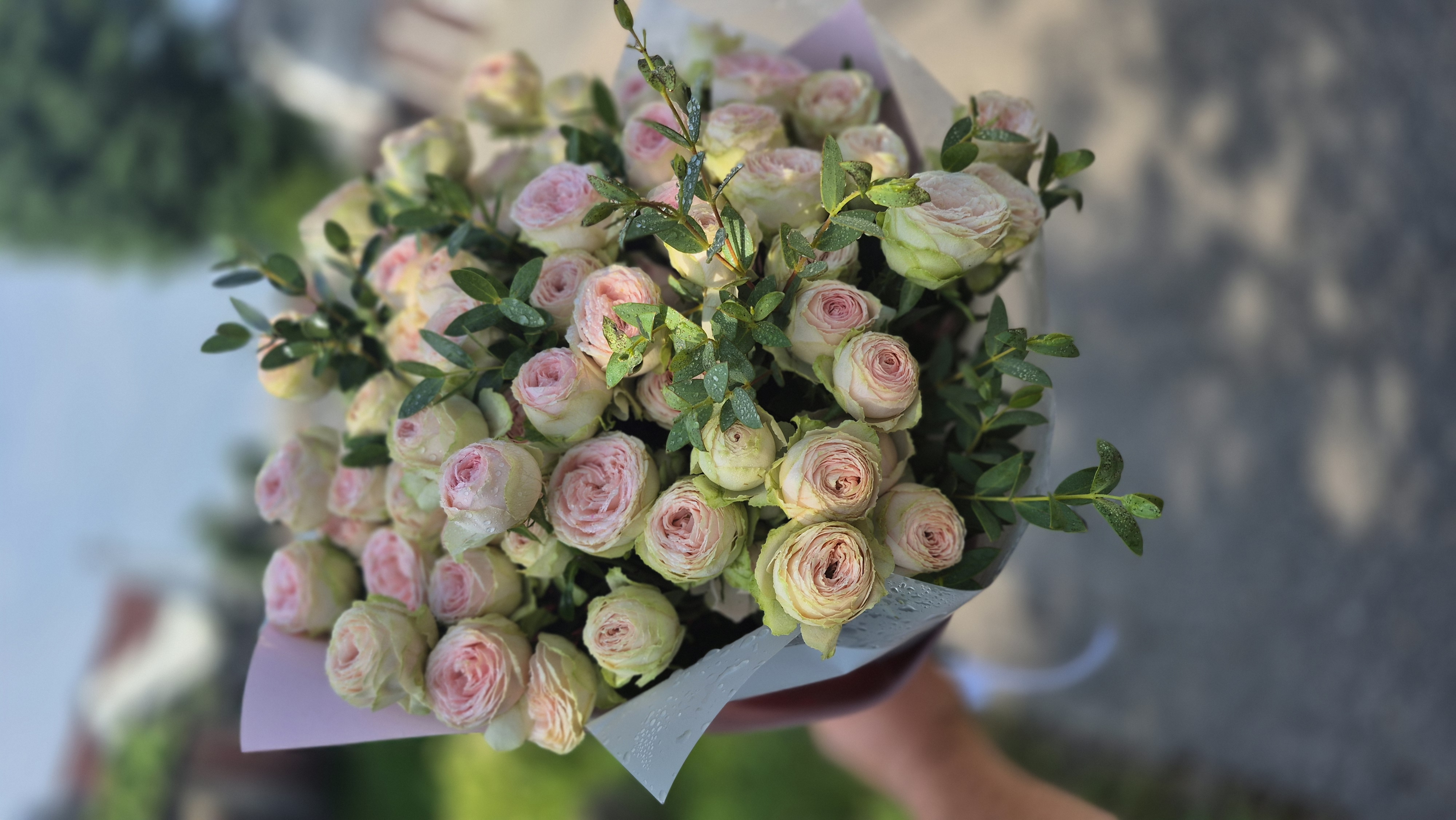 Пышный нежный букет из кустовых пионовидных роз с мелким эвкалиптом 17 свеблей