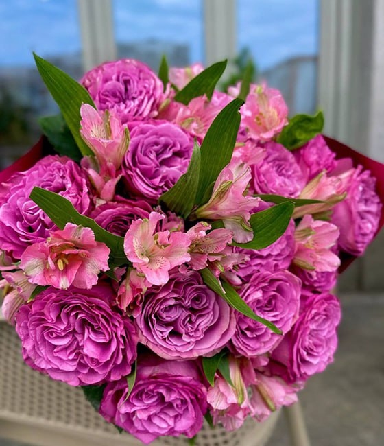 Яркий, стильный букет из фиолетовой пионовидной розы (15шт) и розовой альстромерии (6ст)