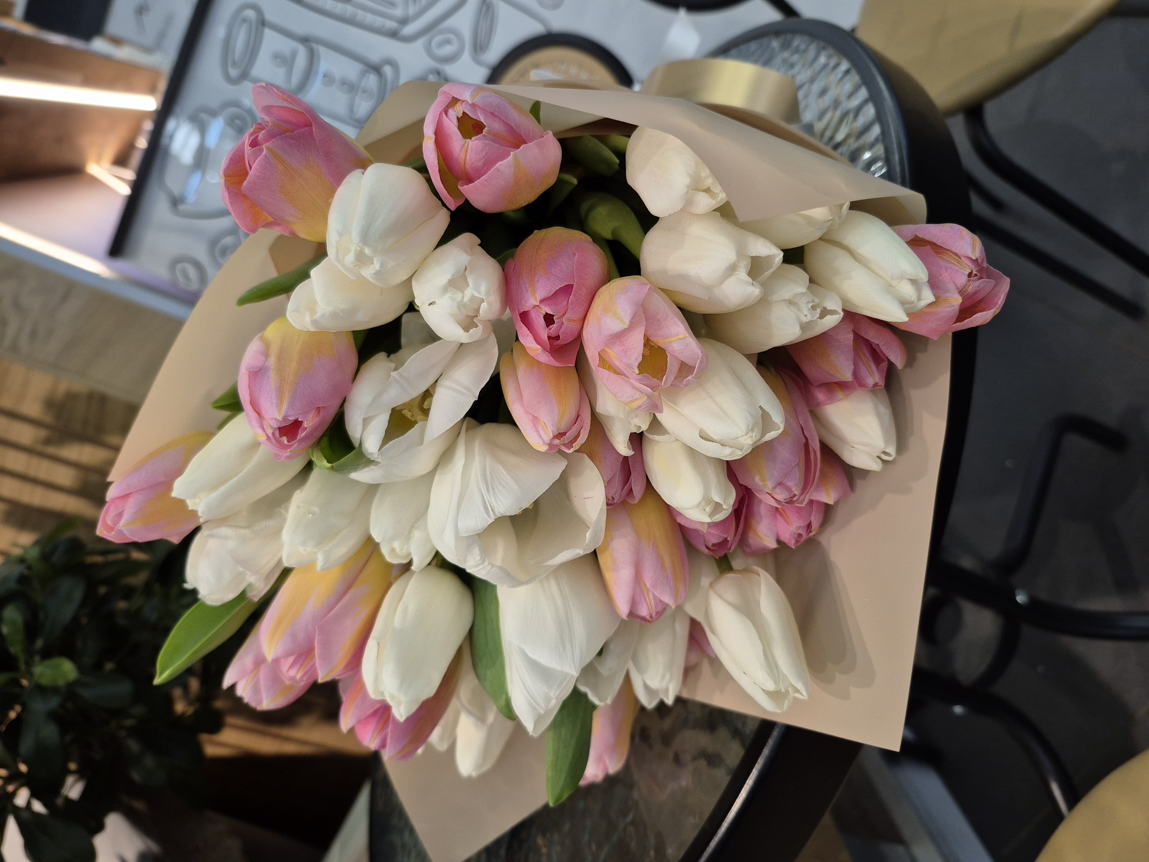Роскошный букет из 51 тюльпана, в белорозовой цветовой гамме.