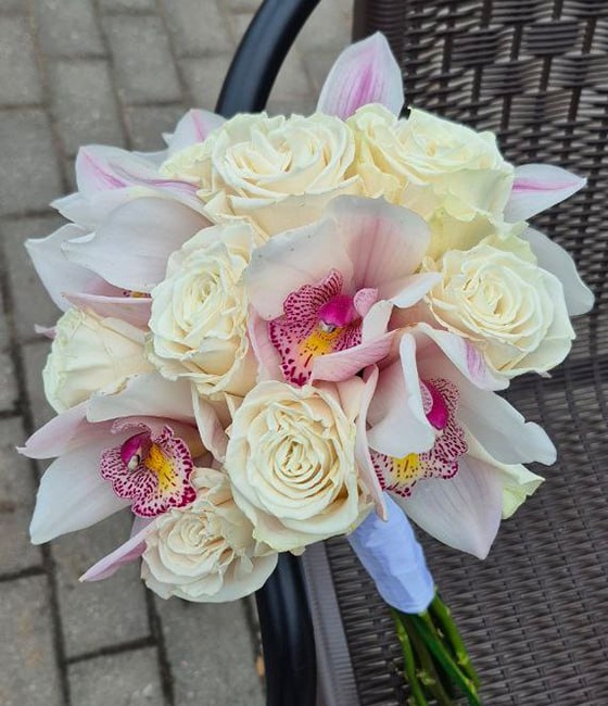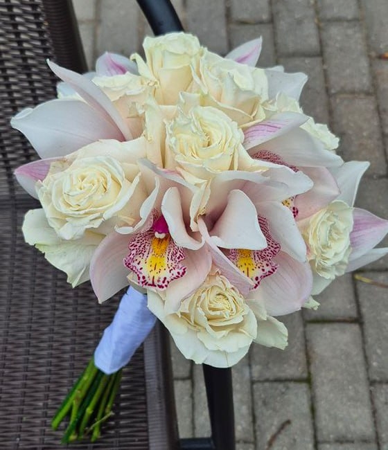 Очень нежный, стильный букет из белых роз и белых орхидей (цимбидиума)