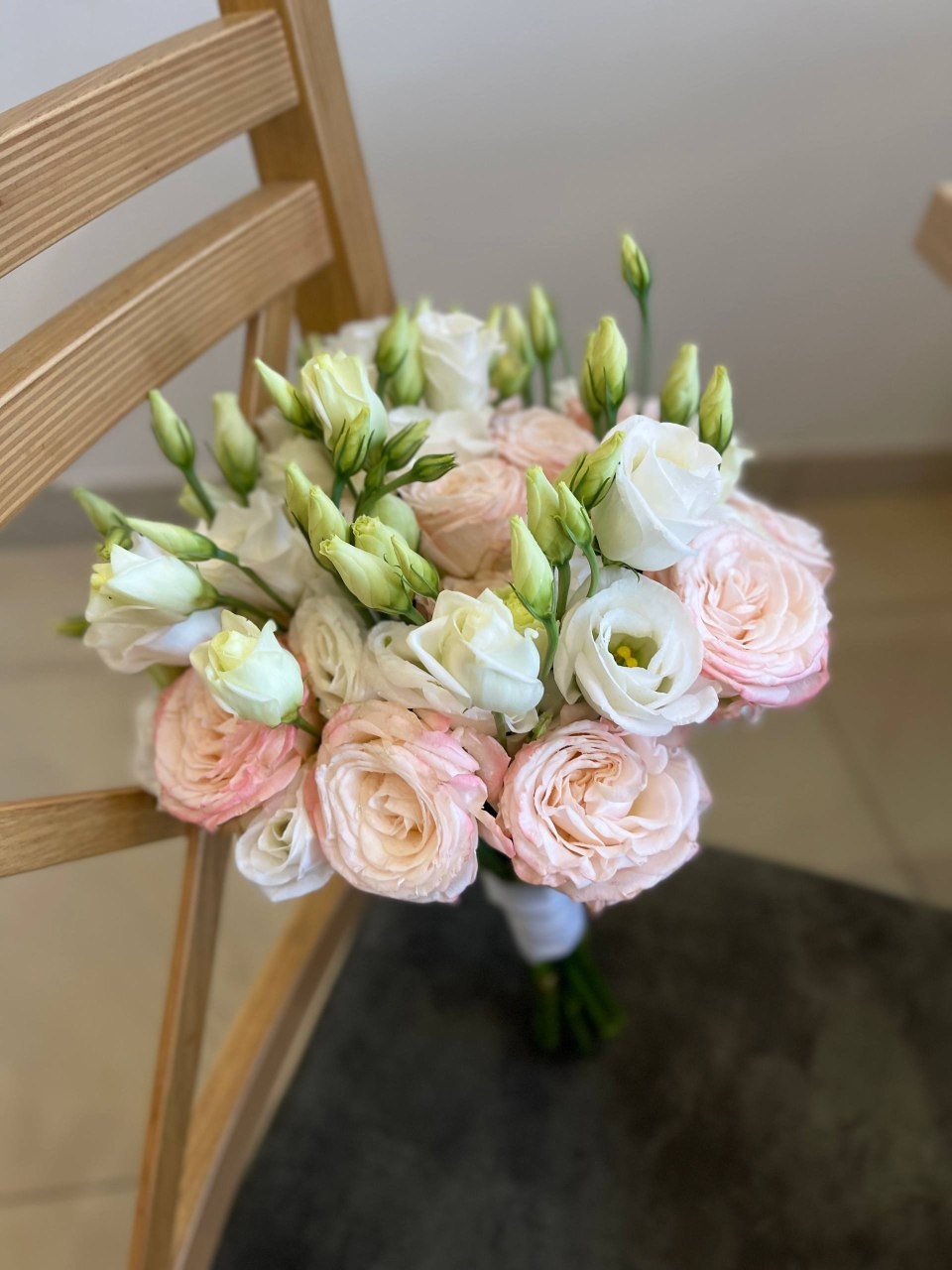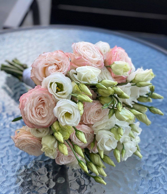 Стильный букет из белой эустомы и нежно розовой пионовидной кустовой розы