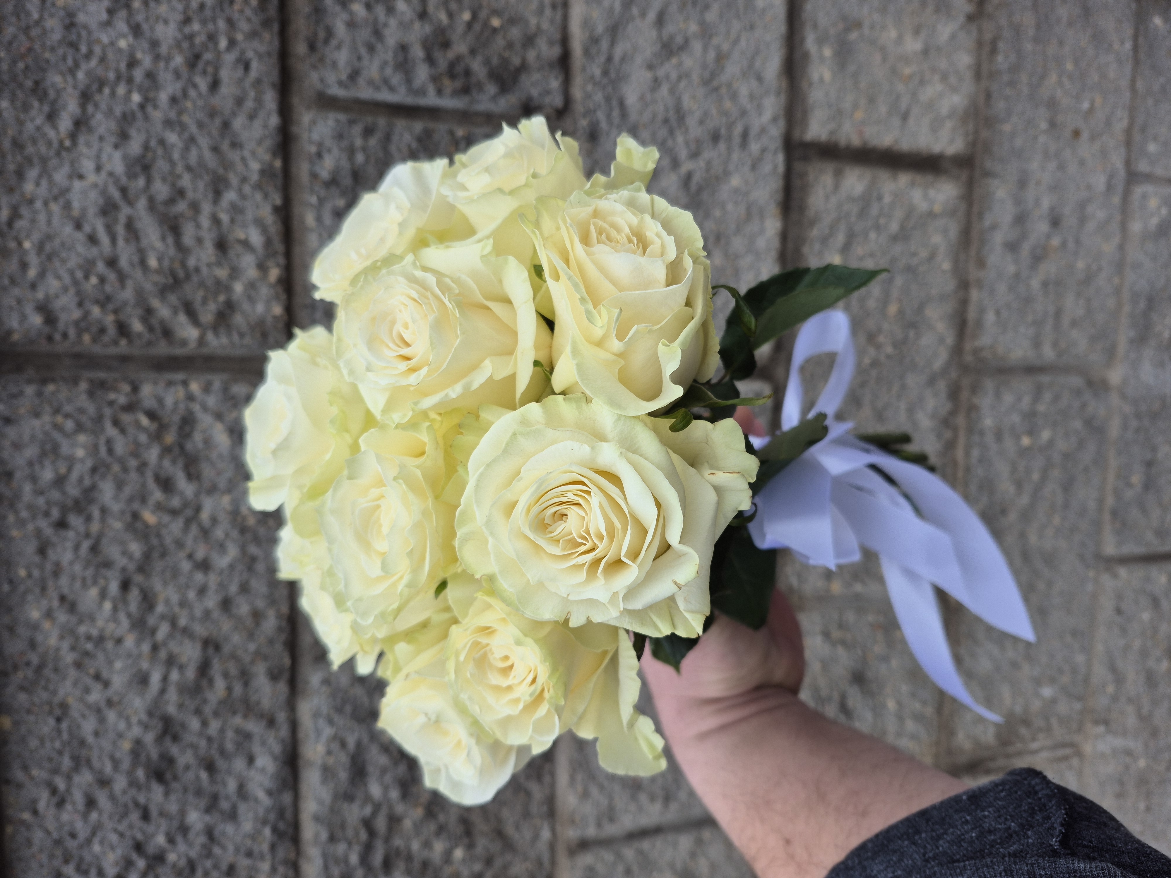 Стильный свадебный монобукет из крупных белых роз. Длинный стебель. Лента по желанию