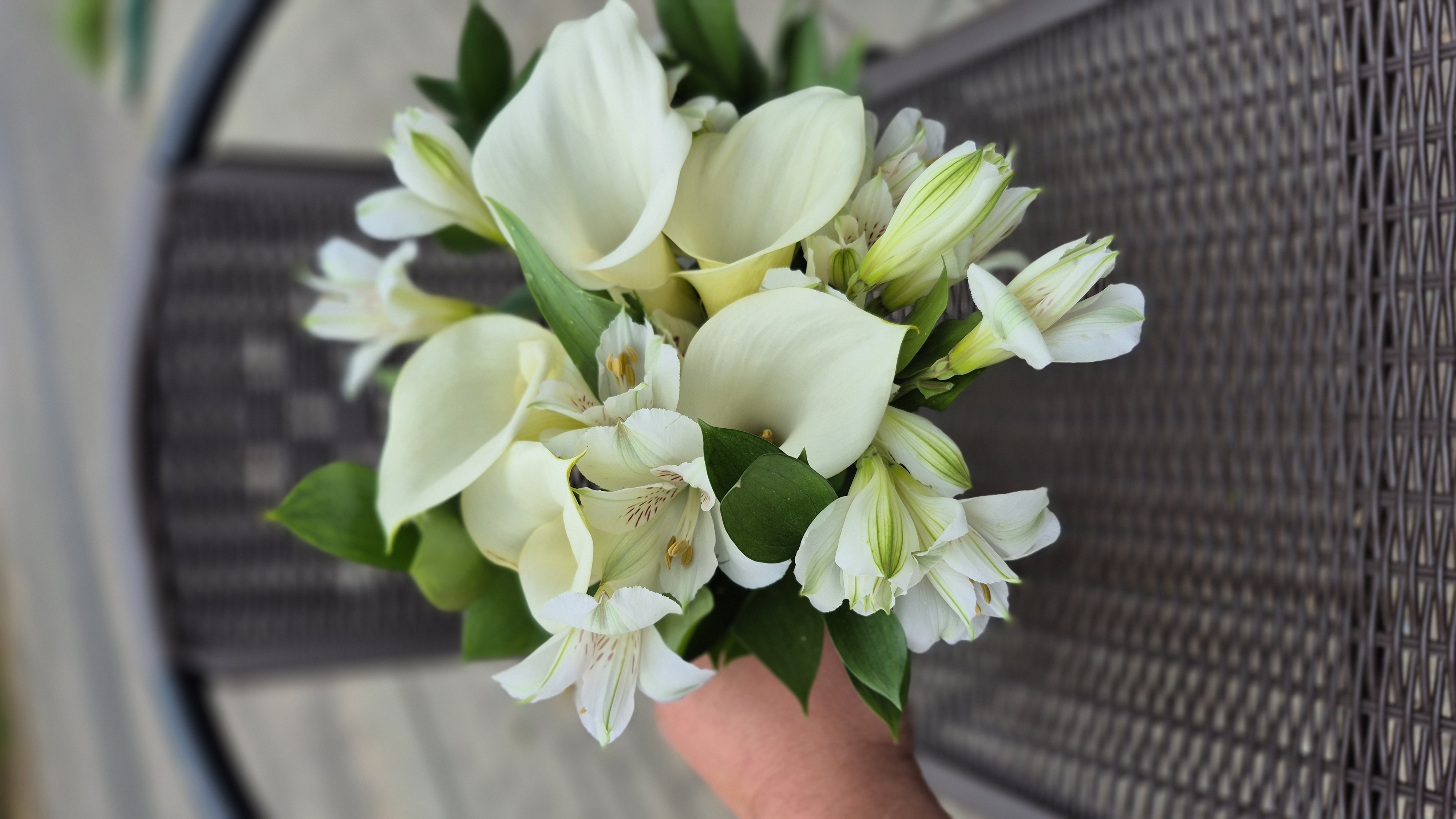 Стильный, необычный букет невесты из белых калл (9шт) и светлой альстромерии ( 5 стеблей)