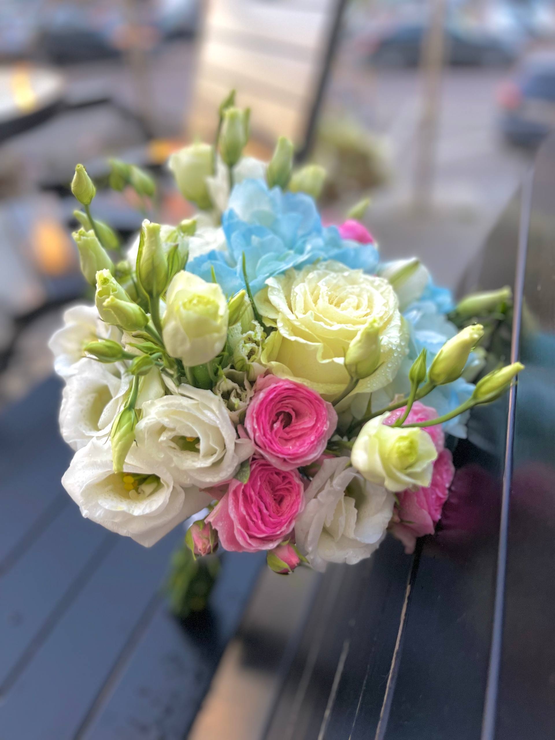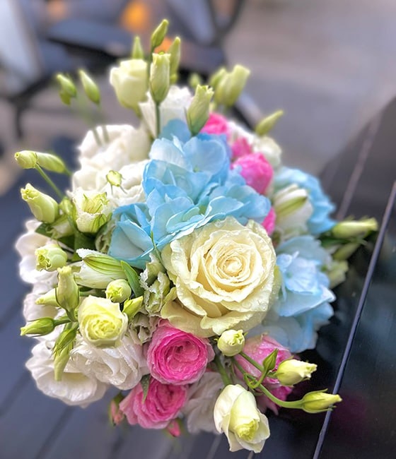 Букет невесты в нежно голубой, белорозовой гамме