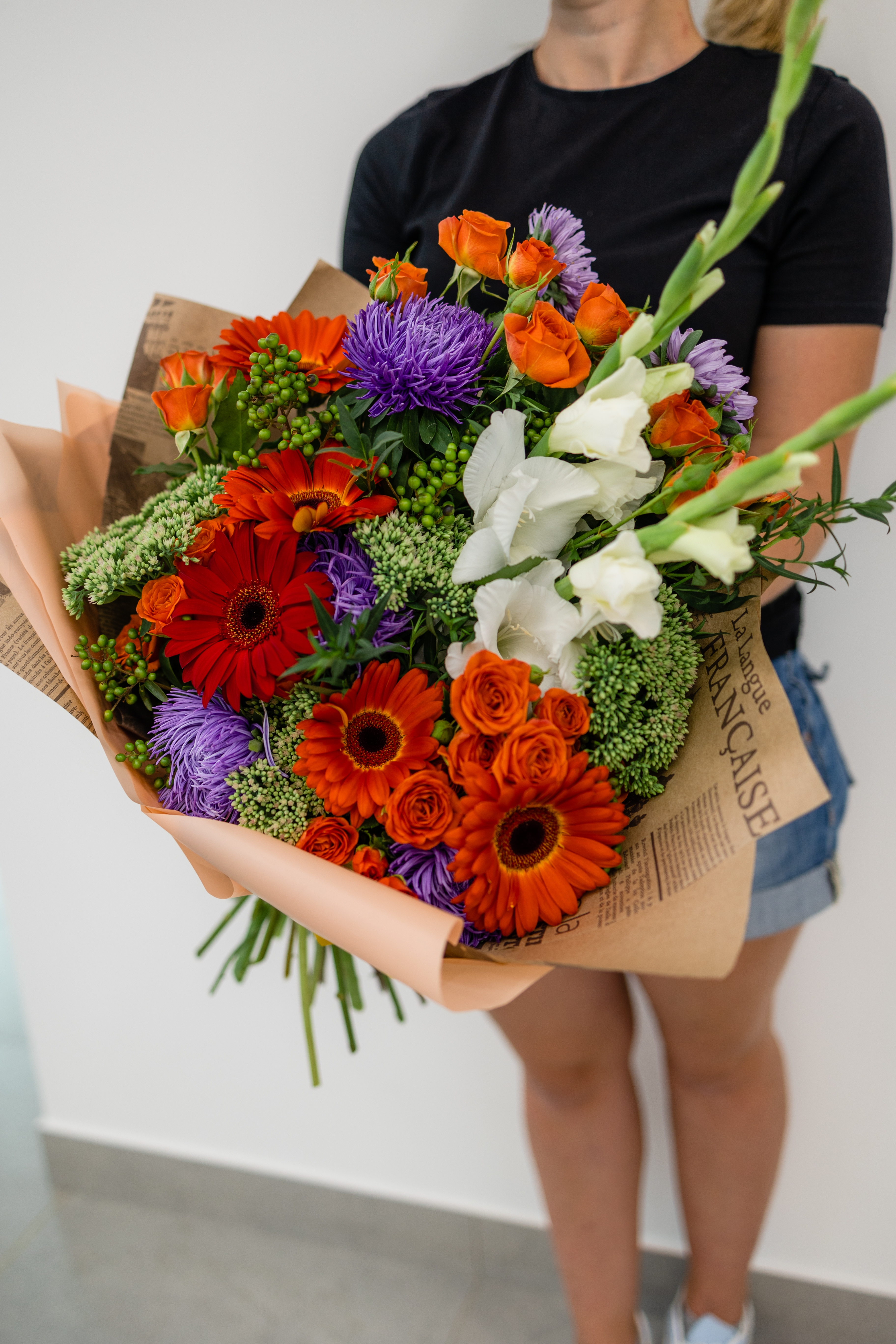 Большой яркий, осенний букет из гербер, гладиолусов, очитка, зелени