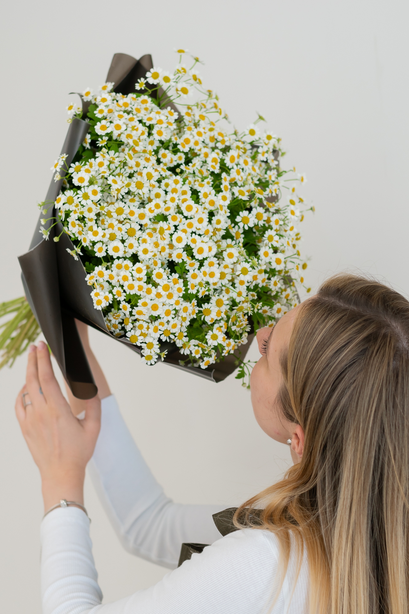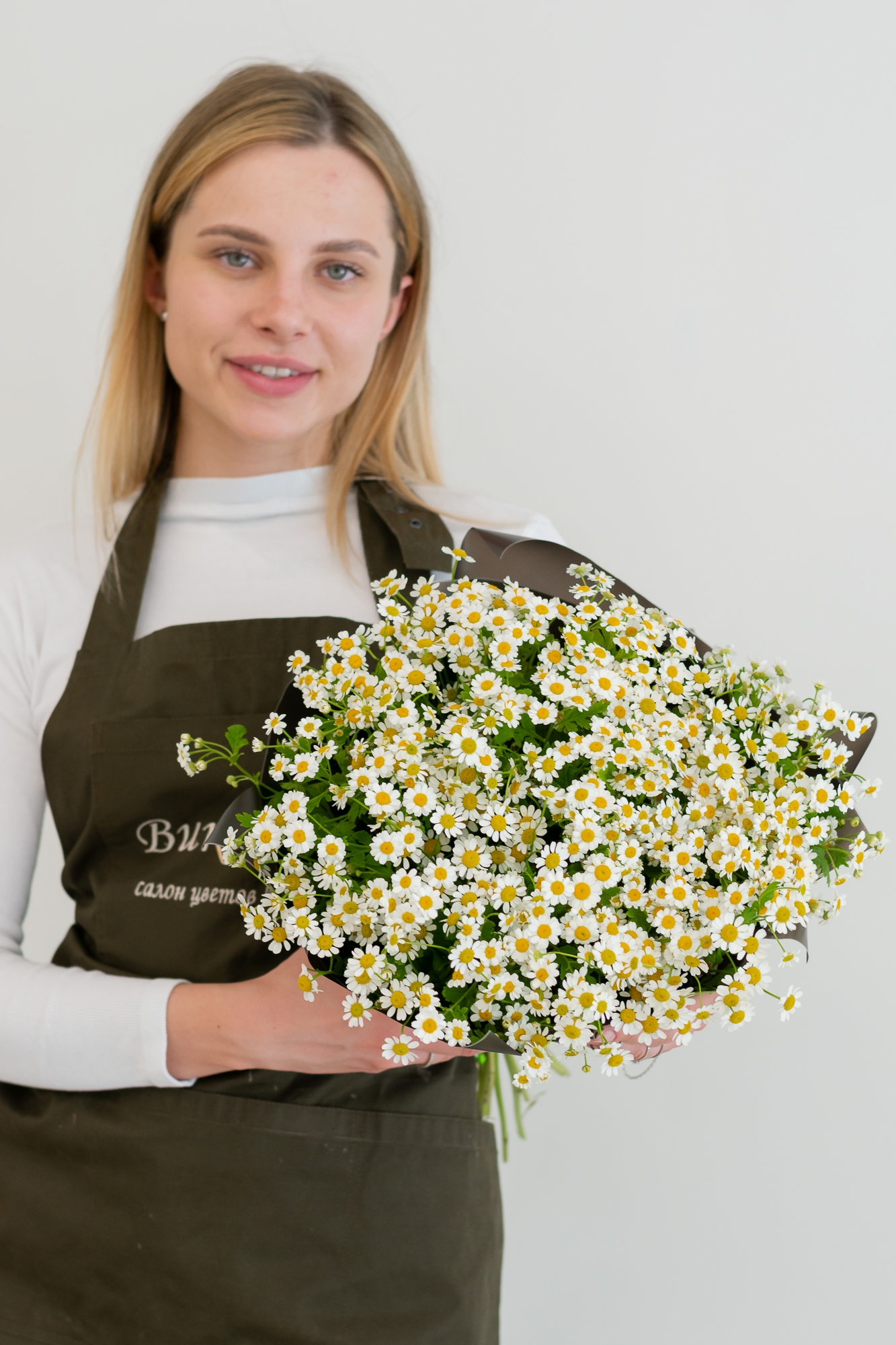 Стильный моно букет из летней мелкой ромашки (танацетума) 17 стеблей Цвет упаковки оговаривается при оформлении заказа