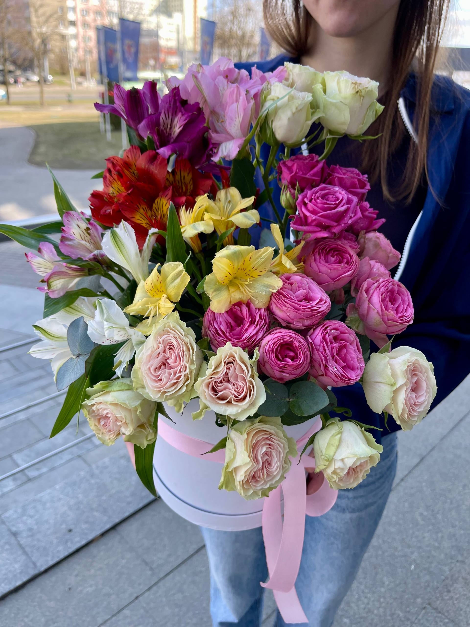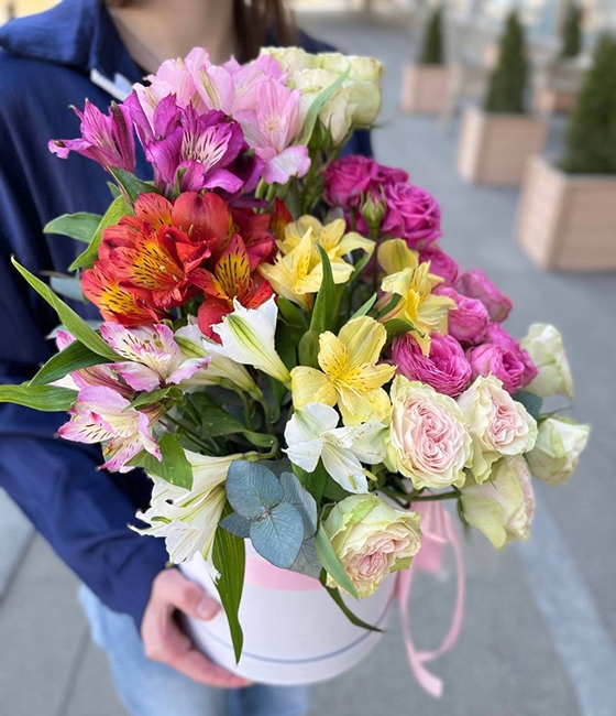 Яркая композиция из альстромерии и кустовой розы, в светлой шляпной коробке
