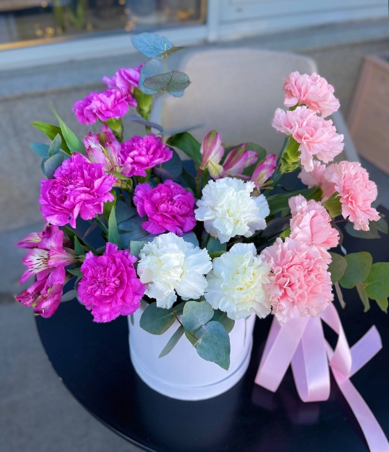 Композиция в шляпной коробке из диантуса нескольких оттенков и альстромерии