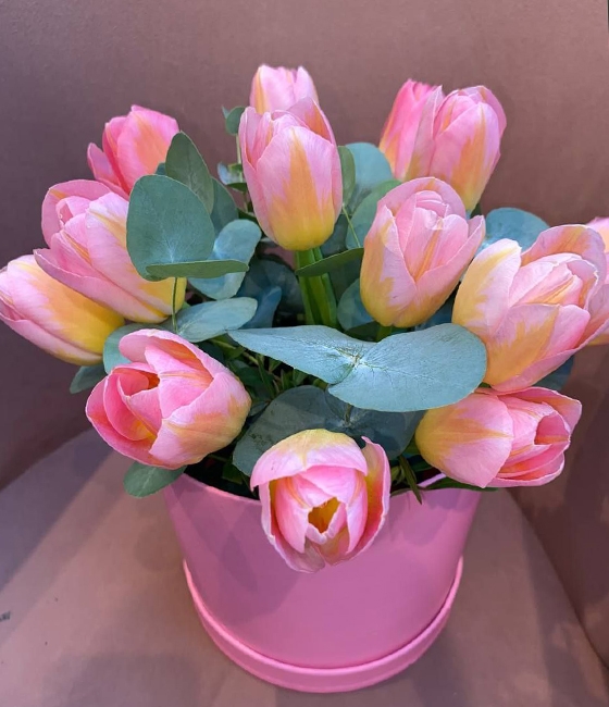 Стильная композиция шляпной коробке из 15 тюльпанов с эвкалиптом