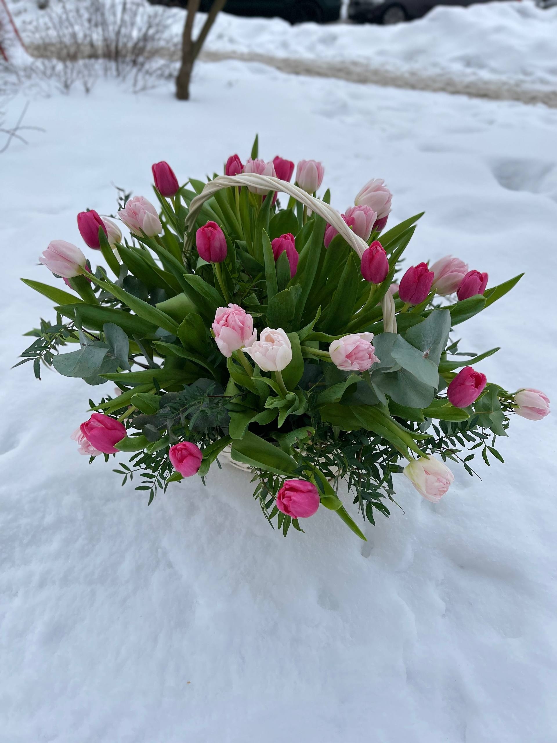 Корзина из 35 тюльпанов разных цветов. Цветовую гамму можно согласовать