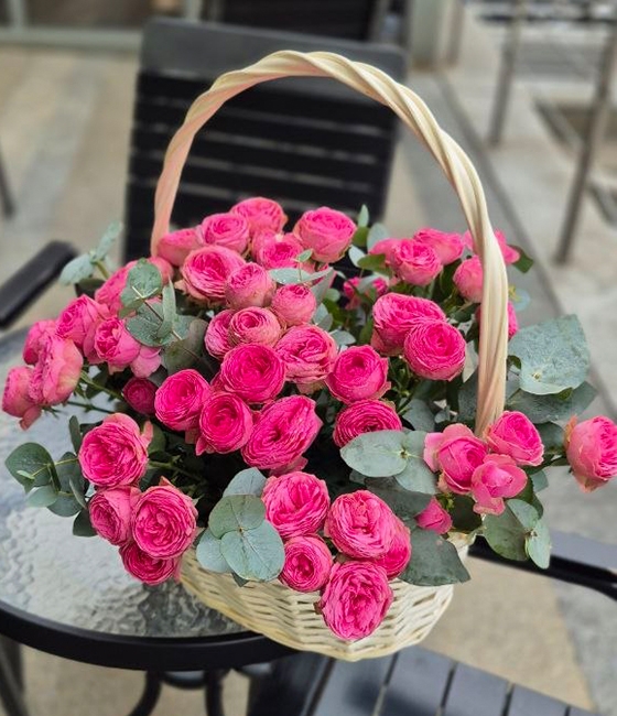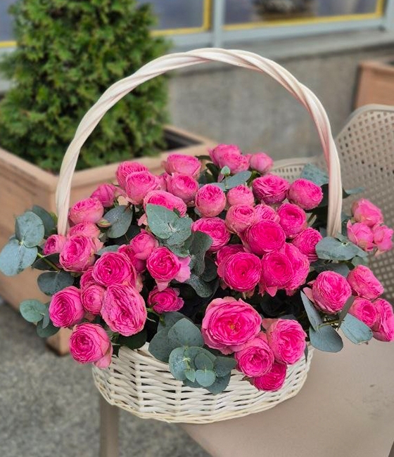 Стильная корзина из пионовидных кустовых роз ярко розового оттенка