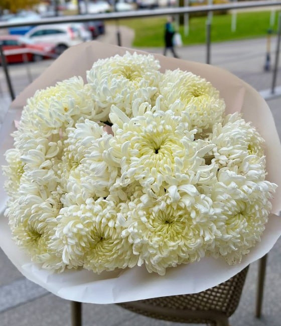 Монобукет из роскошной, белой одноголовой хризантемы (9шт)
