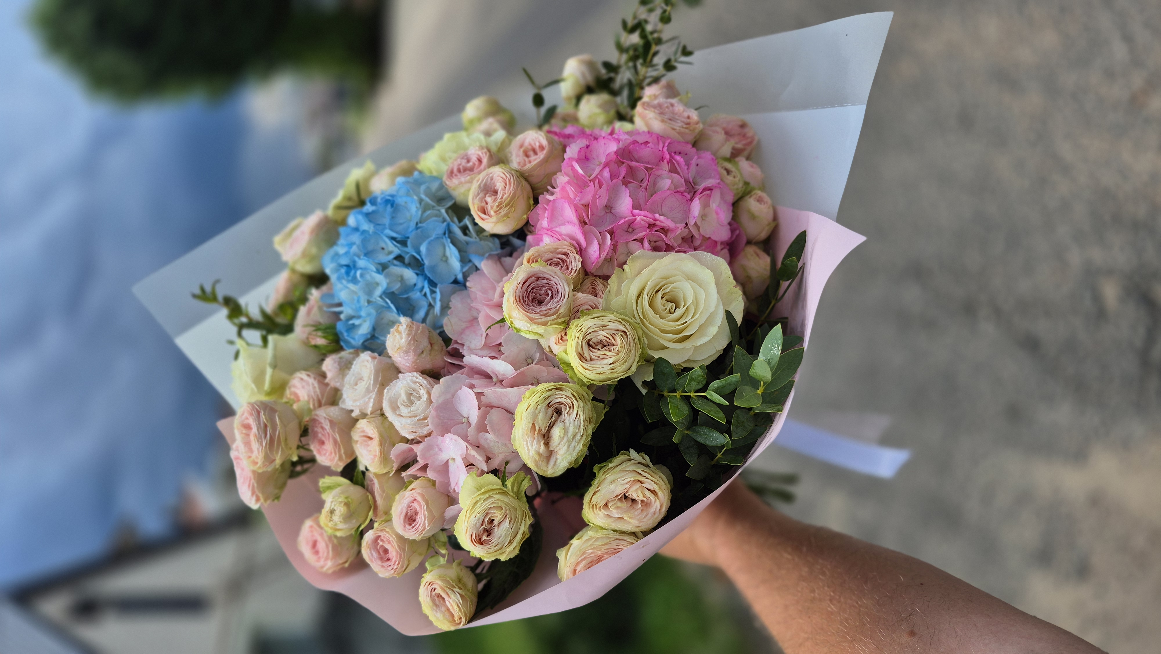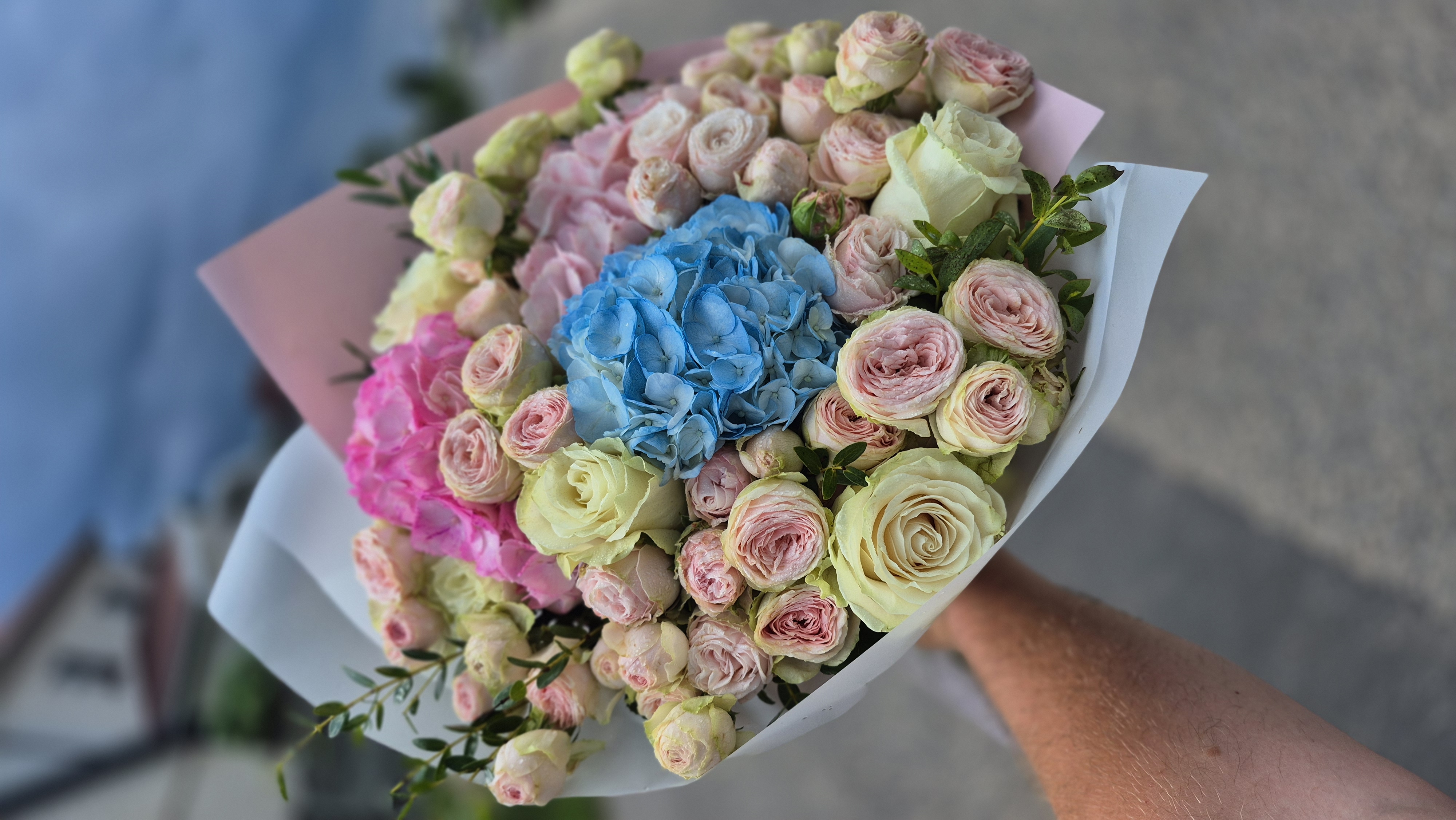 Яркий, пышный букет из разноцветной Гортензии и пионовидной розы