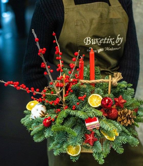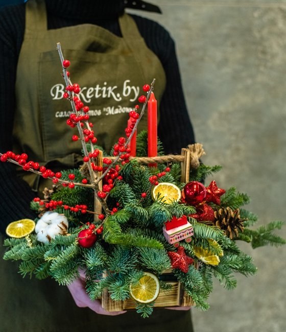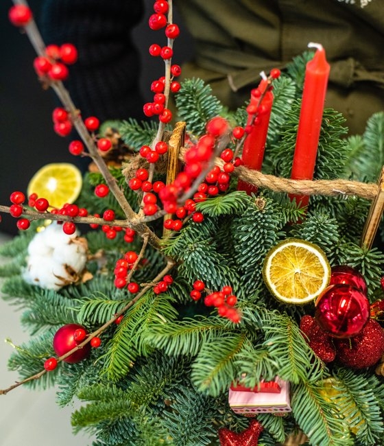 Рождественская композиция в стильном деревянном кашпо из веток Ноблиса со свечами и илексом. Стойкость несколько месяцев