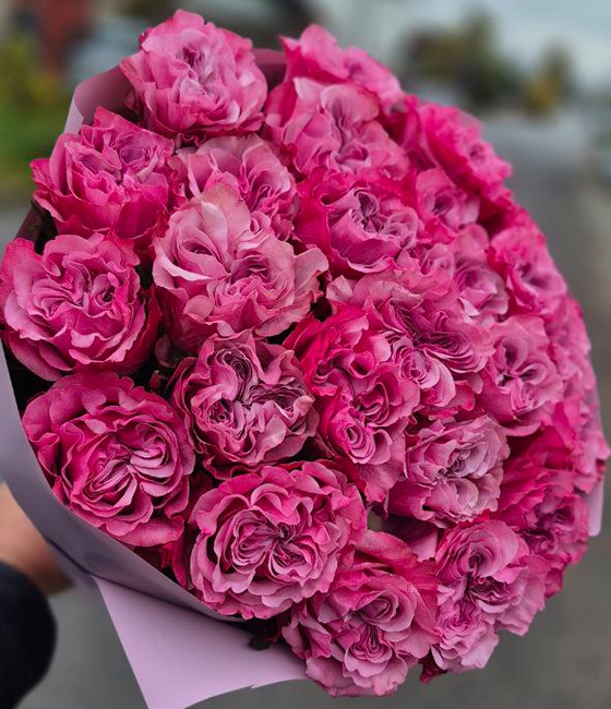Стильный букет из 25 пионовых роз Кантри блюз с оформлением