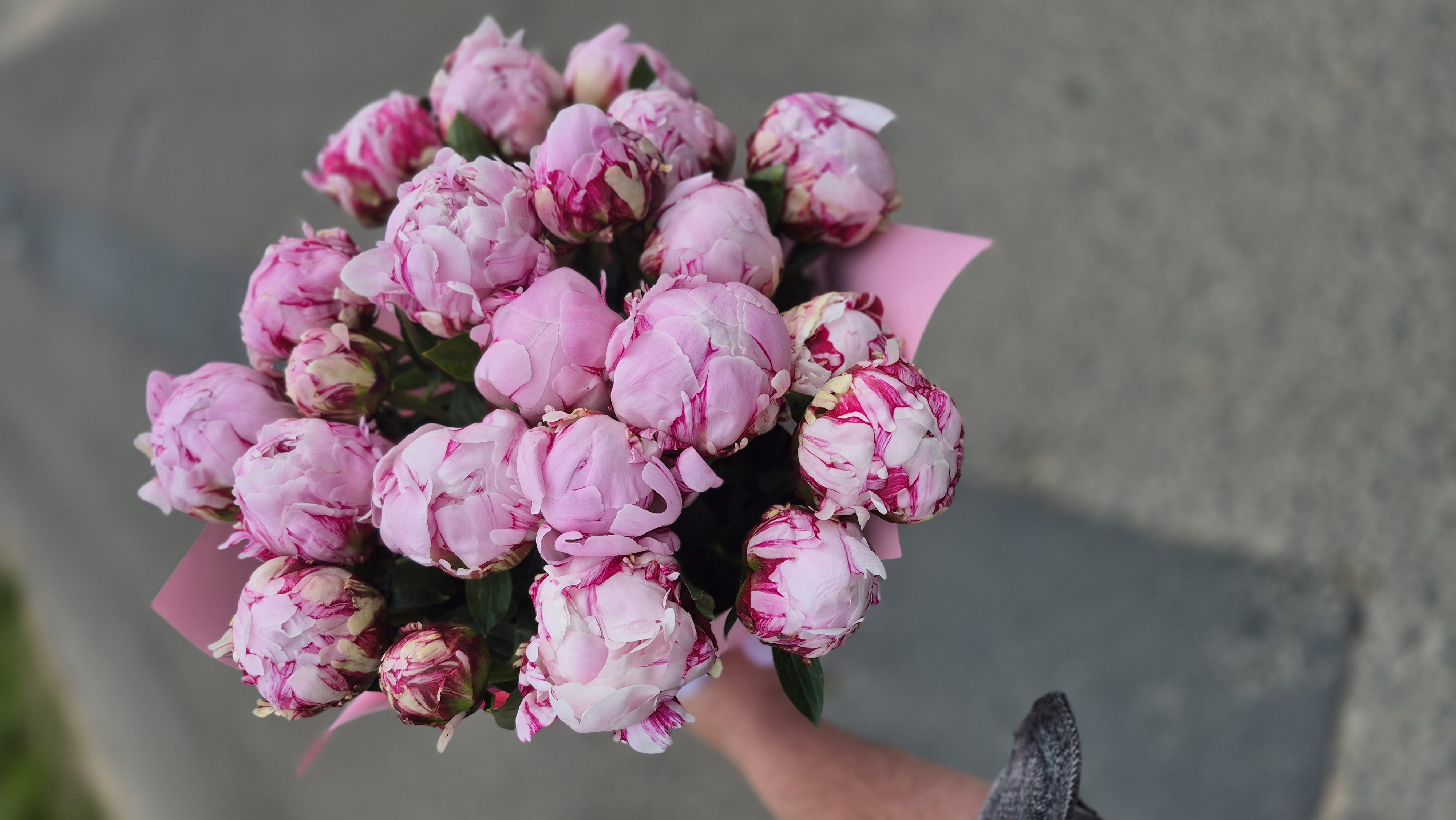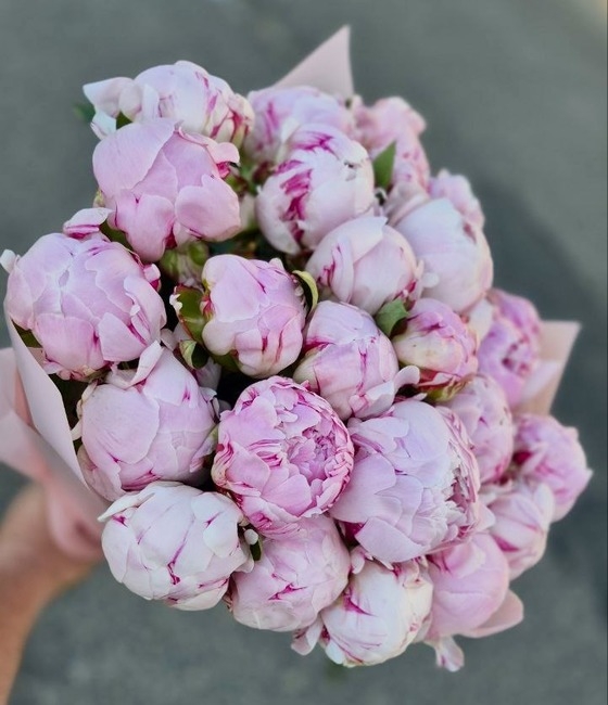 Роскошный букет из 25 нежно розовых пионов сорта Сарра Бернар