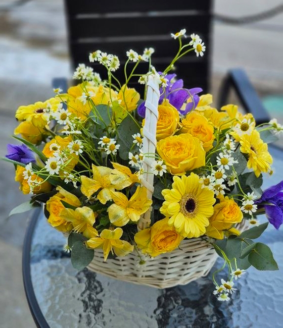 Стильная корзинка в жёлтых тонах. Кустовые жёлтые розы, альстромерия, танацетум, синий ирис