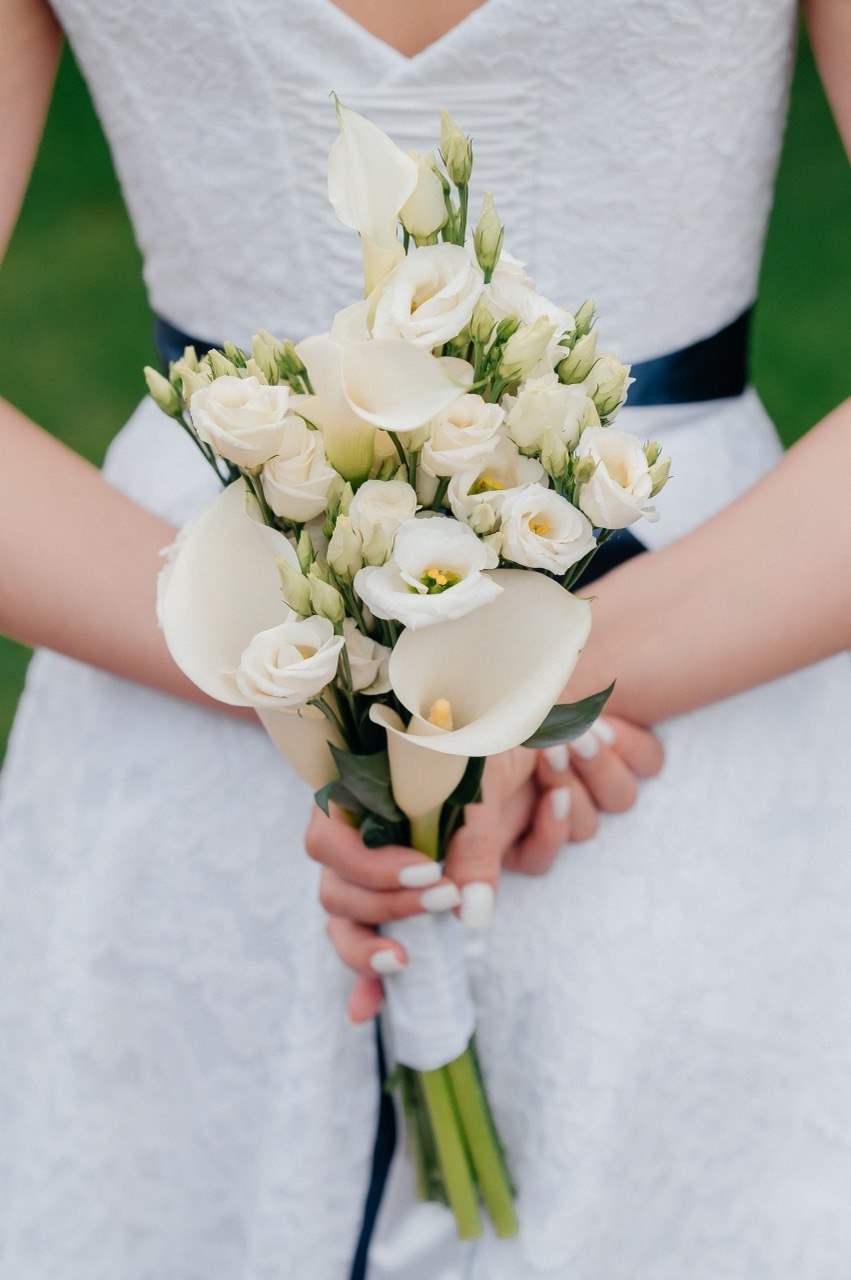 Стильный, аккуратный букет невесты из белых Калл и белой эустомы...