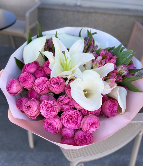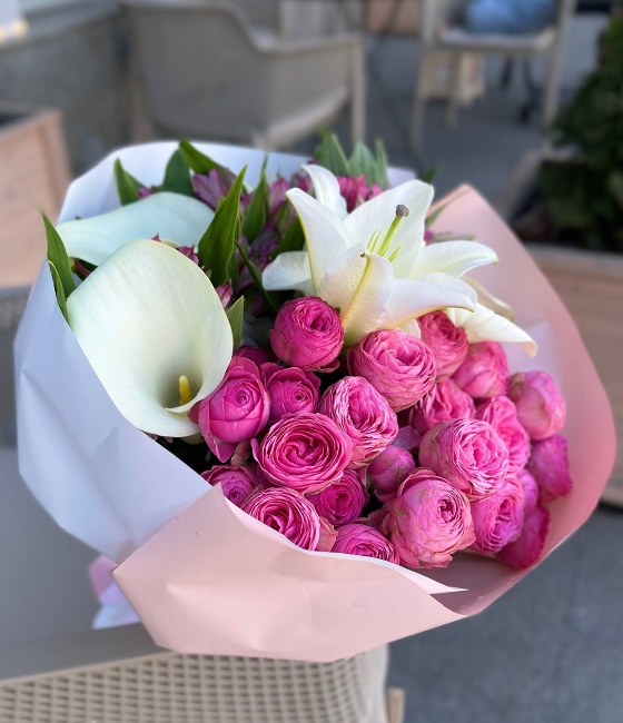 Стильный букет из Лилии, Калл, пионовидных роз