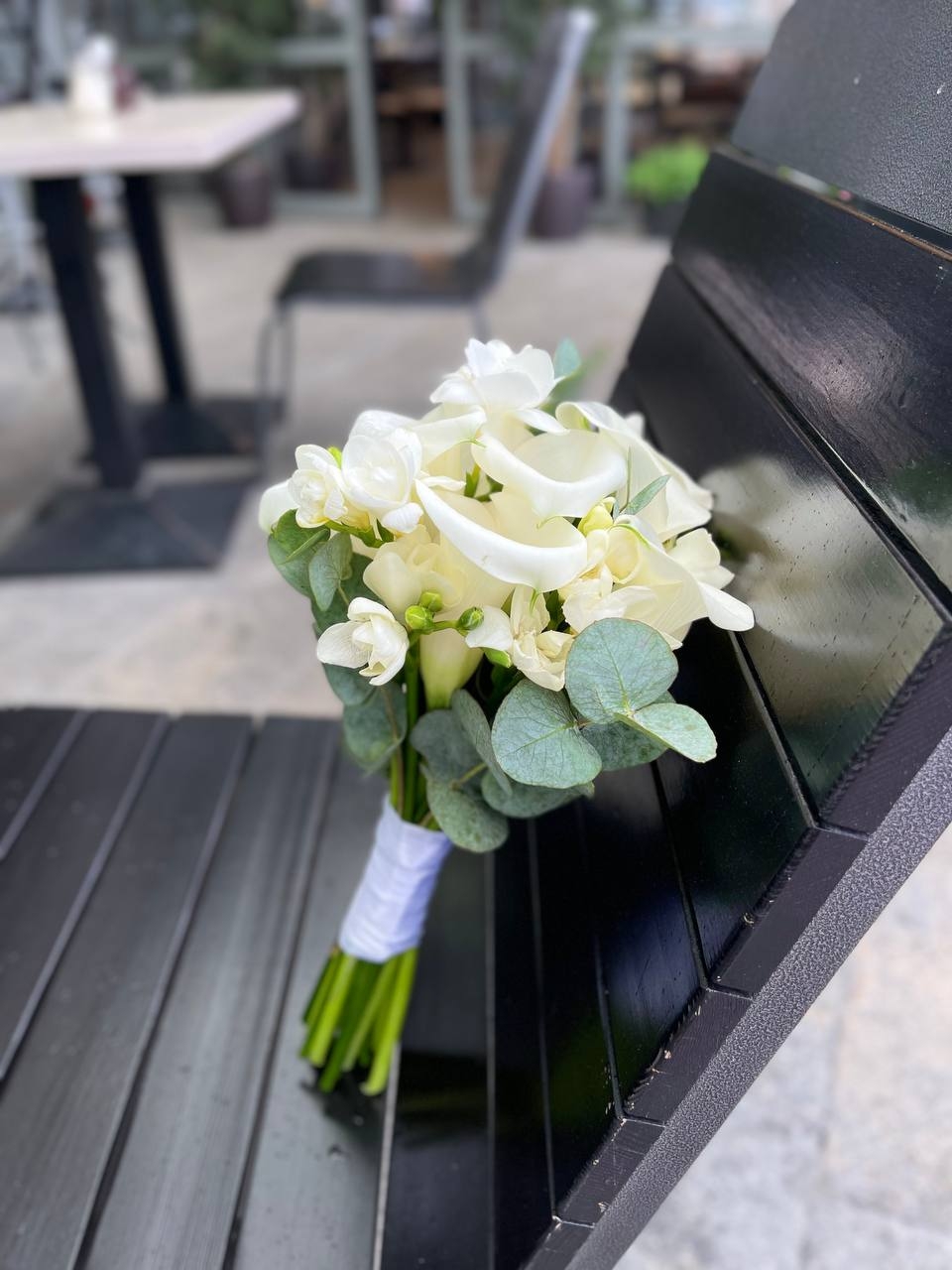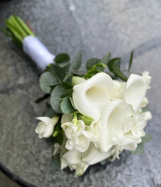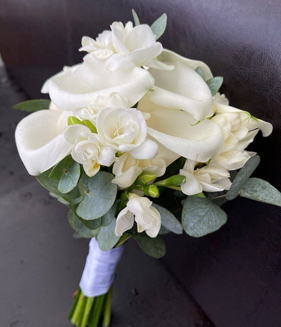 Стильный букет невесты из Калл и фрезий, с эвкалиптом