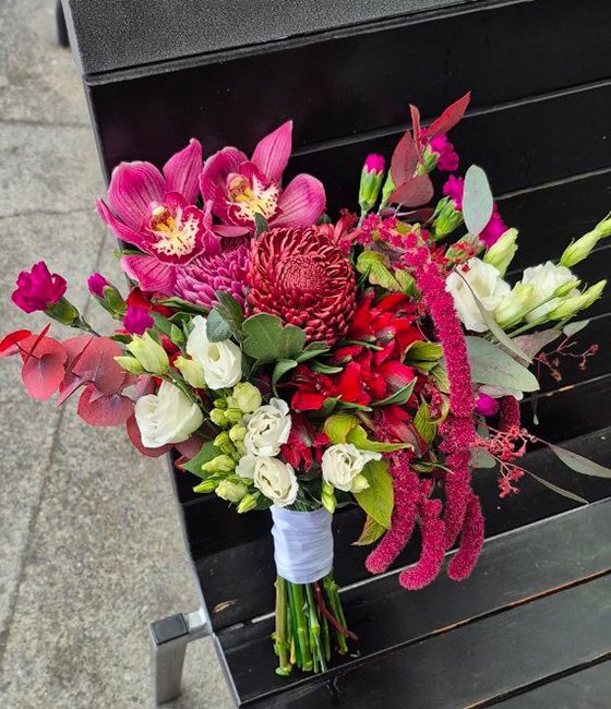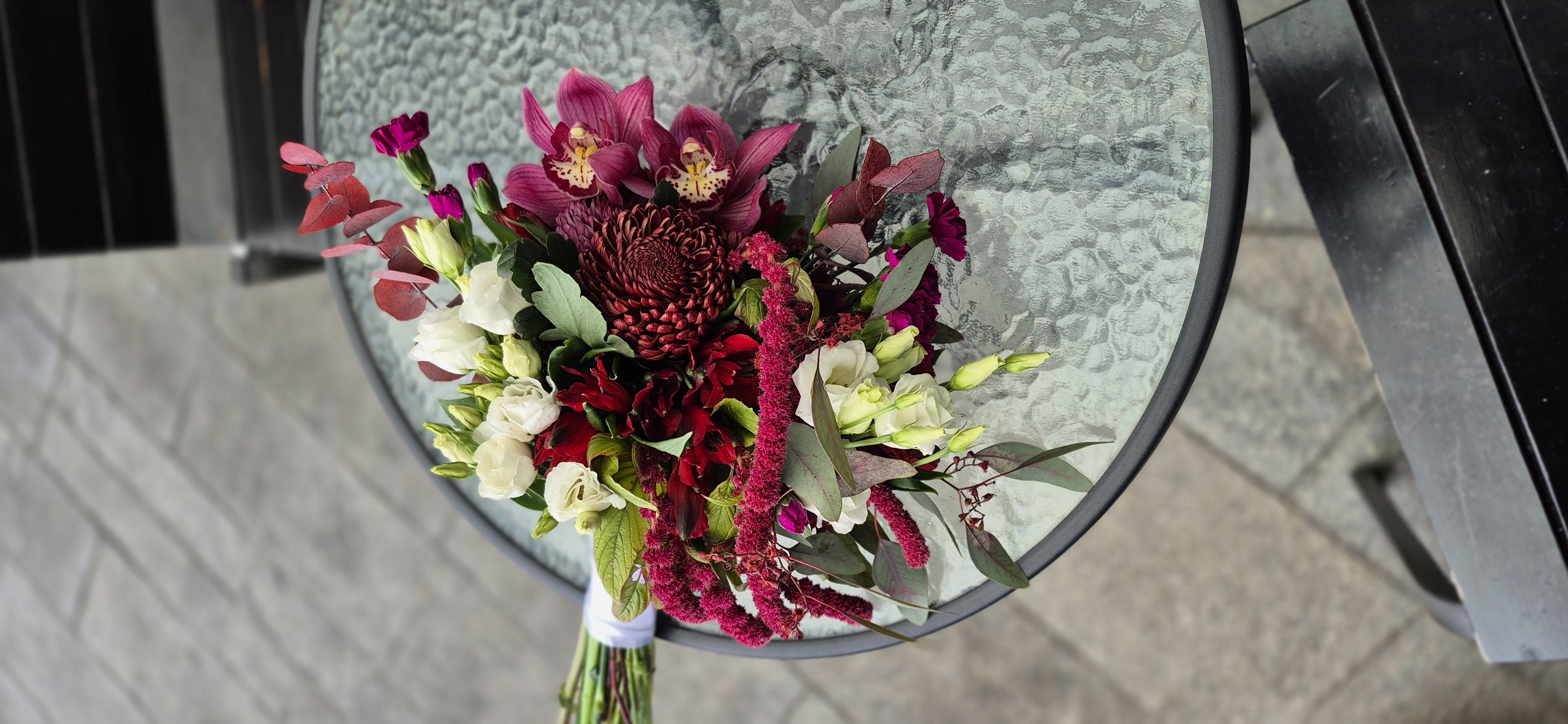 Стильный букет невесты в бортово/красных, сливовых тонах. Орхидеи, амарант, альстромерия, эвкалипт, эустома.