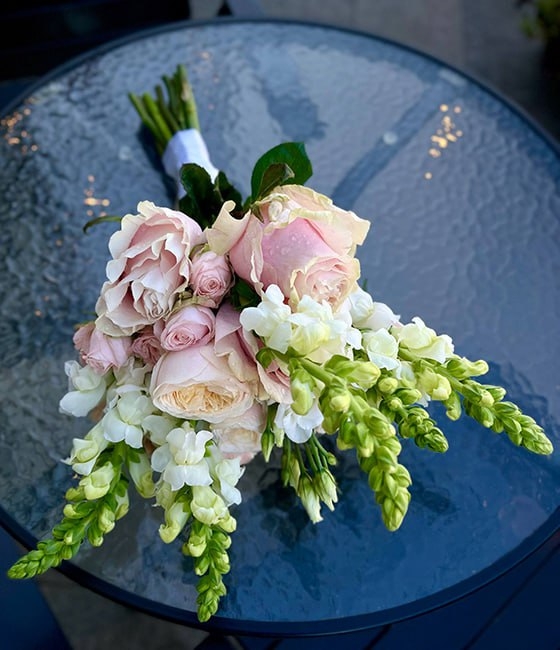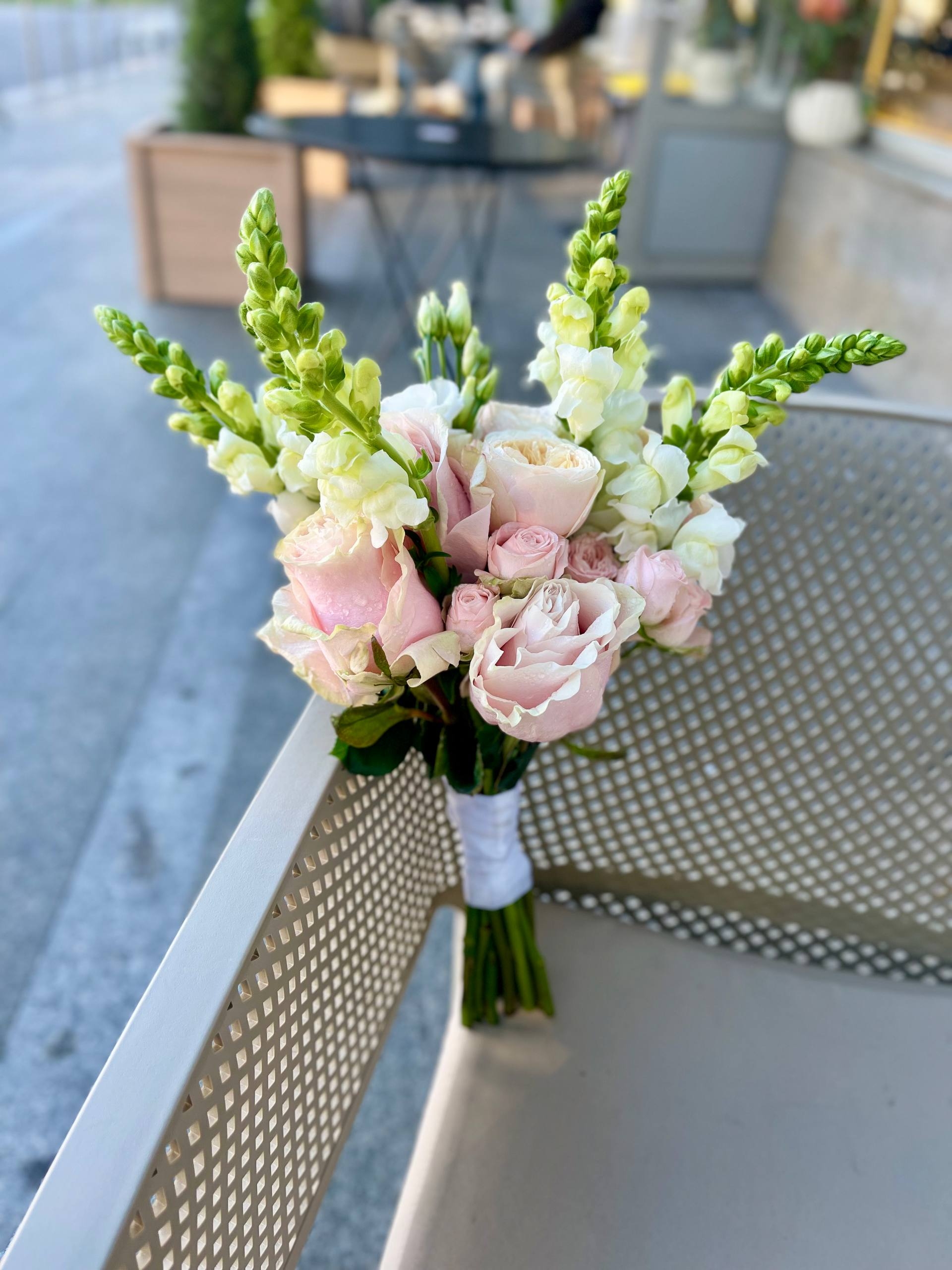 Стильный букет невесты V формы из нежно пудровых роз, кустовых роз, антириума