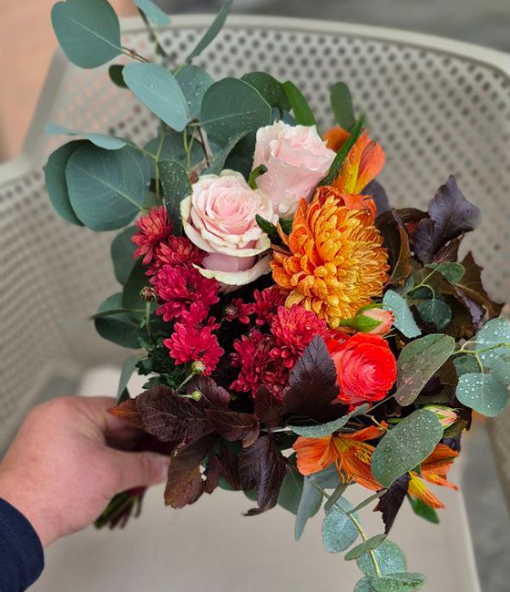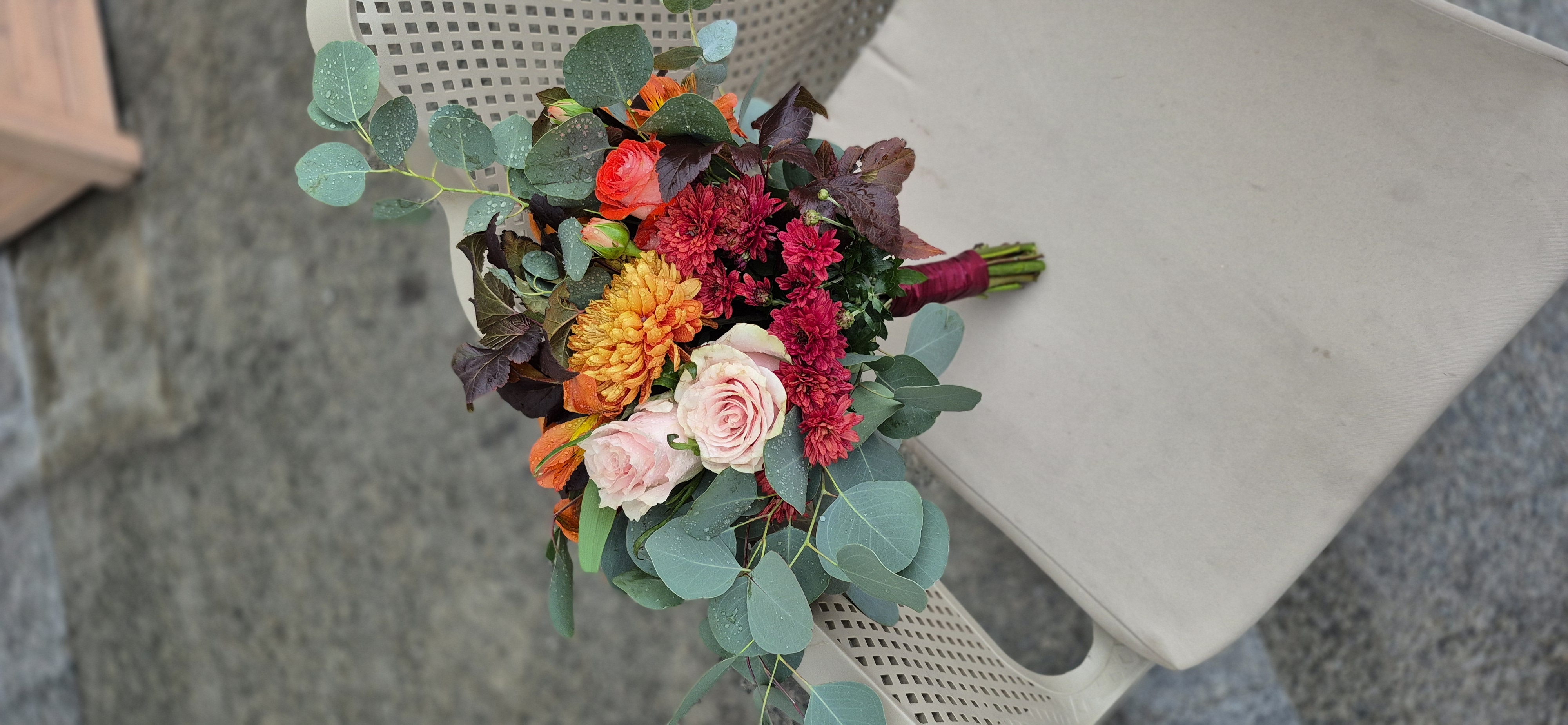 Стильный букет невесты, выполненый в оранжево бордовой гамме