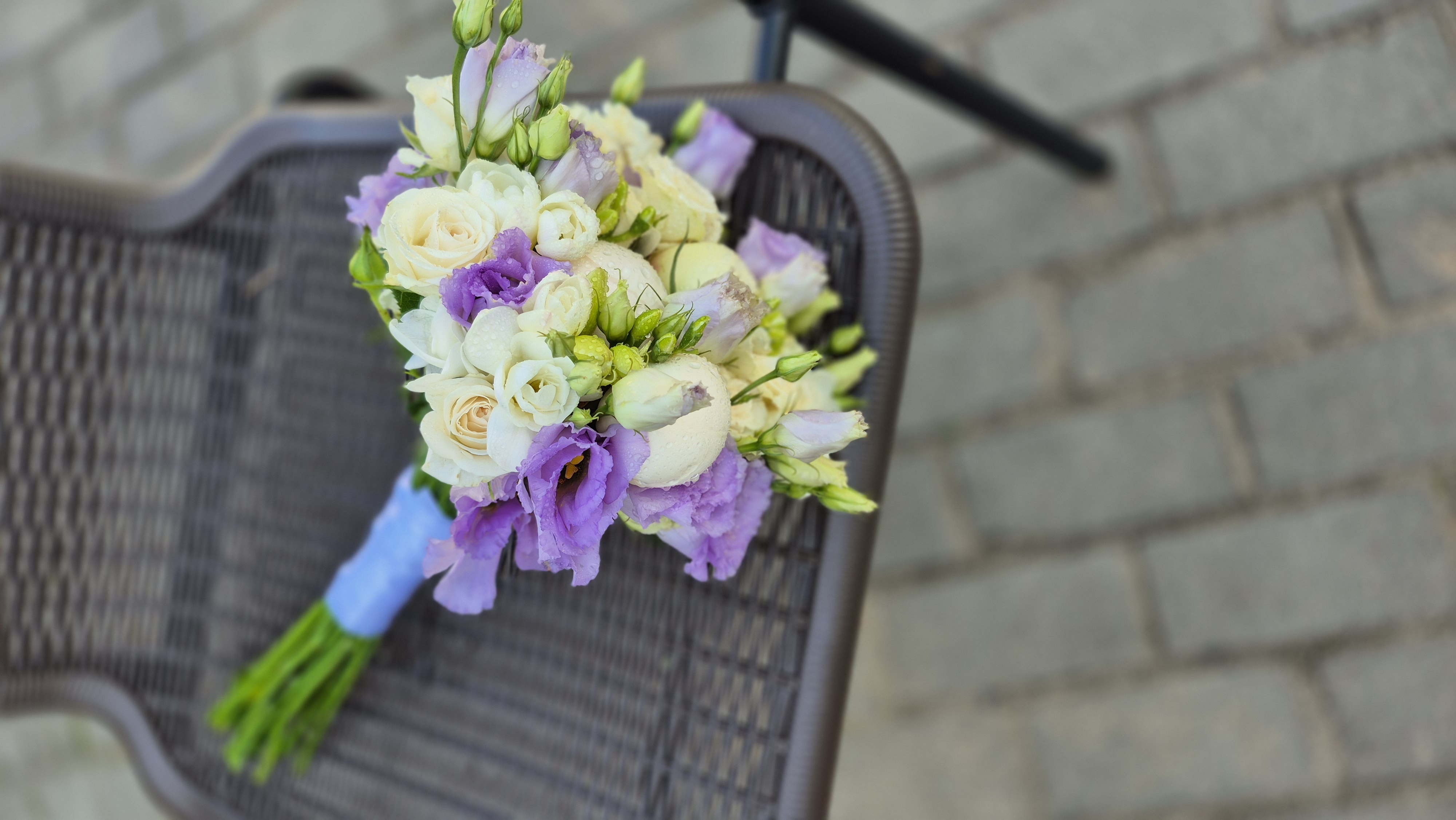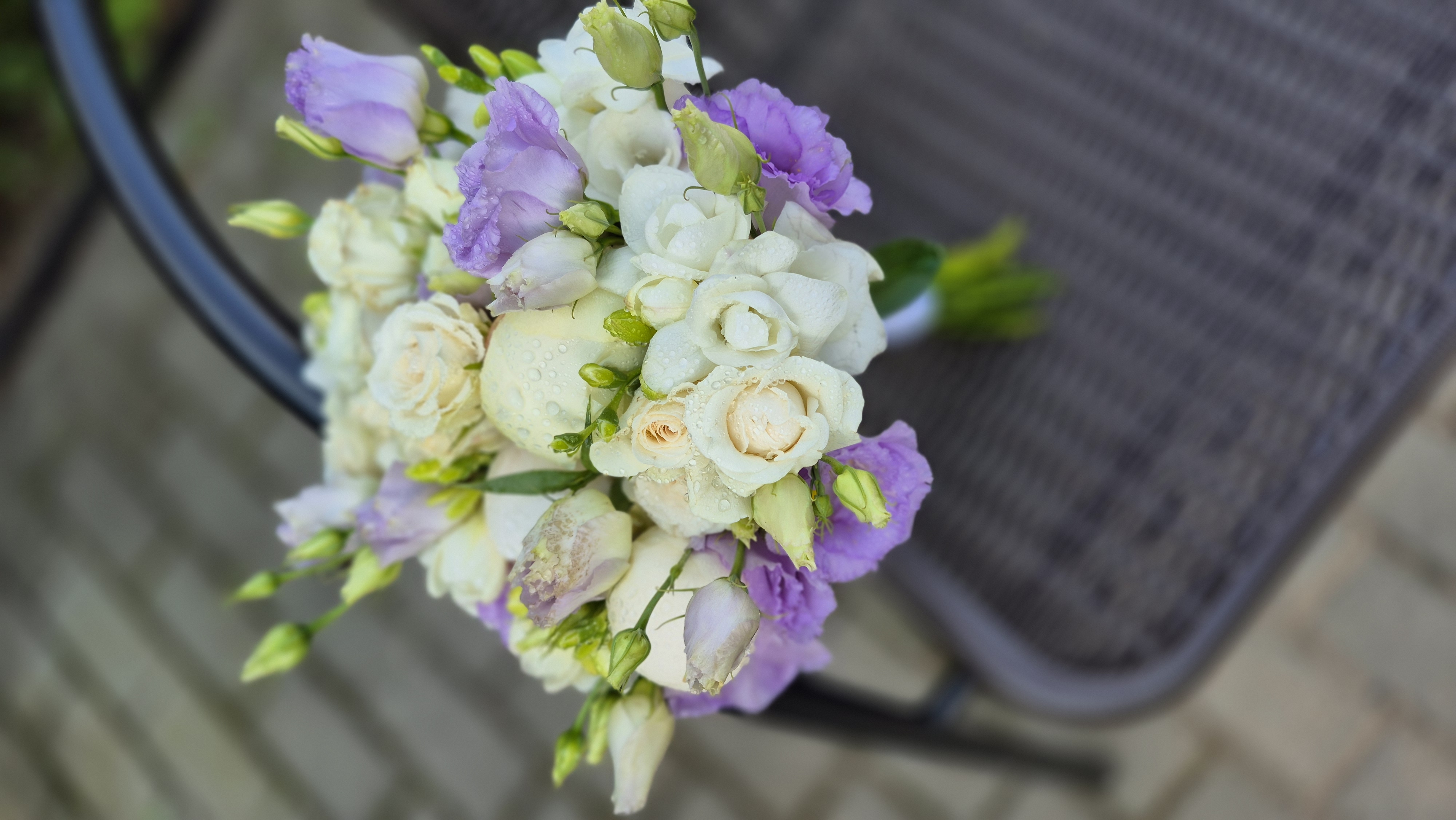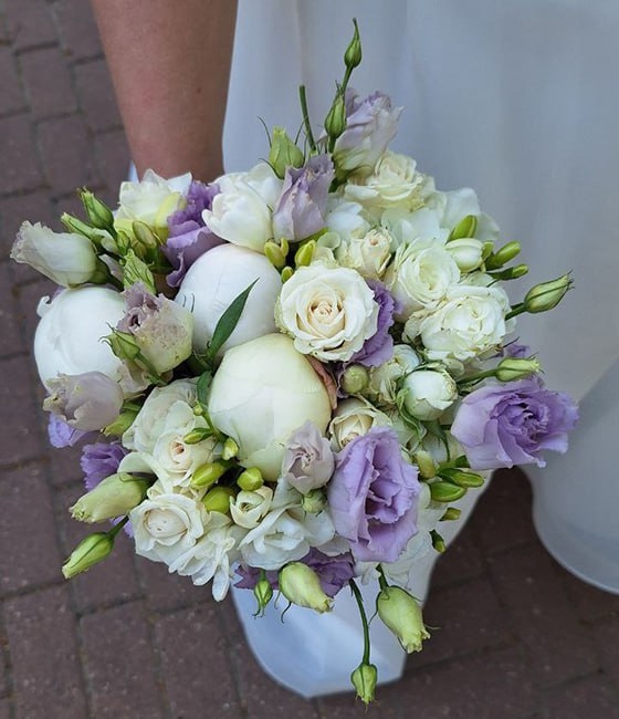 Букет в бело-лавандовой гамме. Из белых пионов и эустомы белого и лавандового цвета