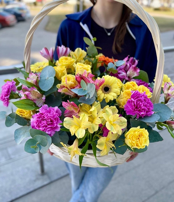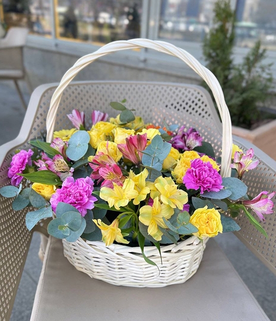 Яркая корзина из Диантусов, кустовой розы, альстромерии