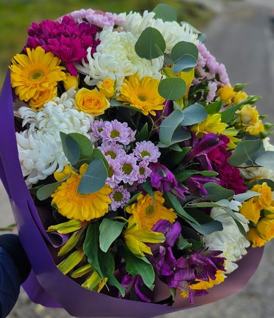 Яркий, стильный, пышный букет. Из альстромерии, кустовых роз, одноголовой хризантемы, герберы, кустовой хризантемы, эвквлипта